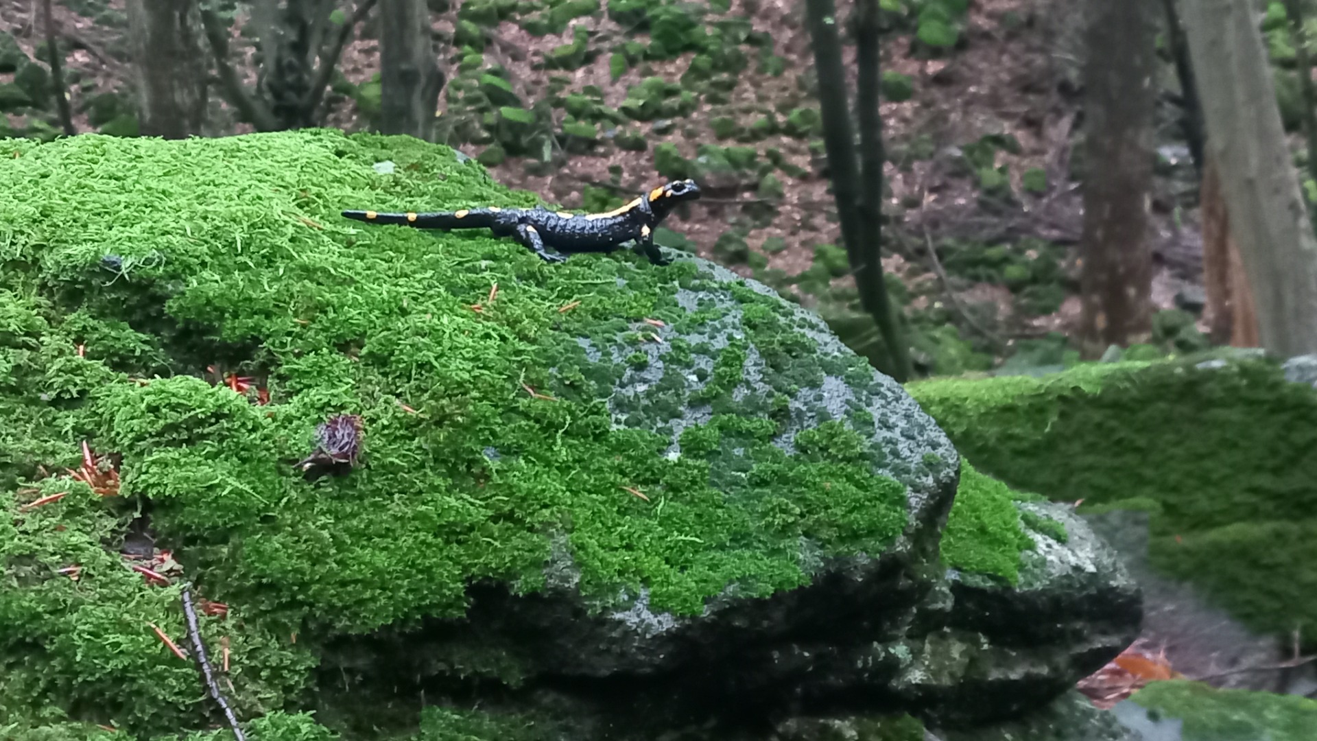 Sikerült tökéletesen lekapnom ahogy sárga foltos barátunk hetykén áll egy sziklán, folyamatosan kapva a nedves cseppeket.